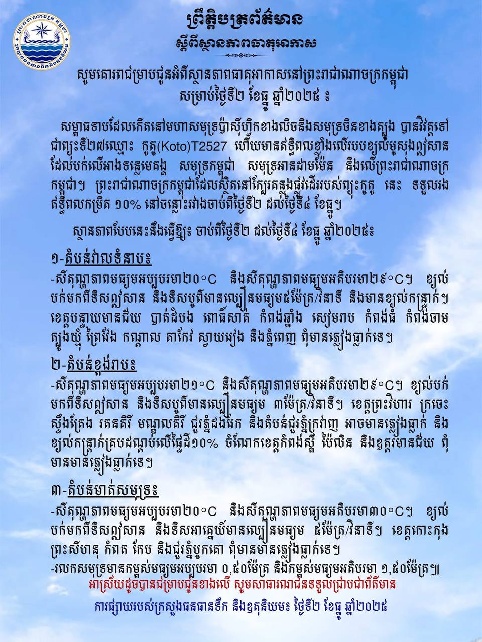 ក្រសូងធនធានទឹក ជូនដំណឹងពីស្ថានភាពធាតុអាកាស សម្រាប់ថ្ងៃទី២ ខែធ្នូ ឆ្នាំ២០២៥