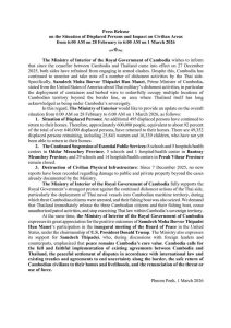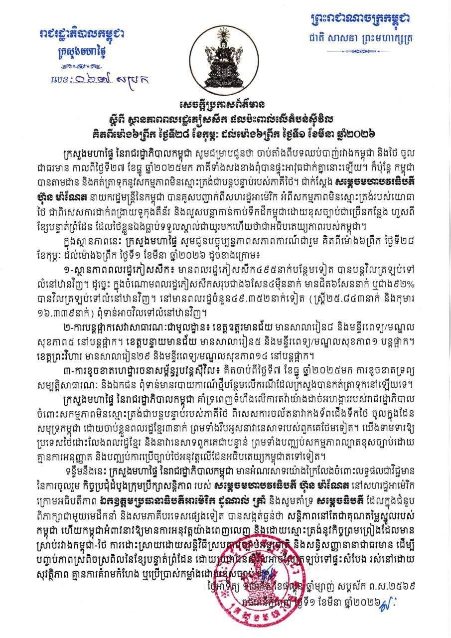 សេចក្ដីប្រកាសព័ត៌មាន ស្ដីពី ស្ថានភាពពលរដ្ឋភៀសសឹក និងផលប៉ះពាល់លើតំបន់ស៊ីវិល គិតត្រឹមព្រឹក ថ្ងៃទី១ ខែមីនា ឆ្នាំ២០២៦។ Press Release on the Situation of Displaced Persons and Impact on Civilian Areas as of the Morning of 1 March 2026.